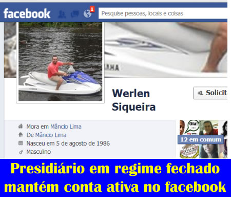 A nossa produção, pesquisou o nome de perfil [Werlen Siqueira] na rede social pelo endereço eletrônico fornecido pelo Iapen, e para surpresa, mesmo não podendo ler todas as suas mensagens por não fazermos parte dos seus 441 contatos, é possível verificar que, no dia 28 de outubro deste ano, ou seja, 3 meses após ele ter sido colocado atrás das grades, por meio de telefone móvel celular, o presidiário interagiu com um de seus contatos na rede social, que pelas mensagem trocada é uma moça que diz ser prima dele.