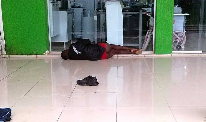 Uma cena foi flagrada por transeunte na manhã deste sábado na cidade de Brasileia, quando ia para o trabalho. Não se sabe que nacionalidade seria o homem que dormia tranquilamente em frente a uma loja nas proximidades da delegacia do município.